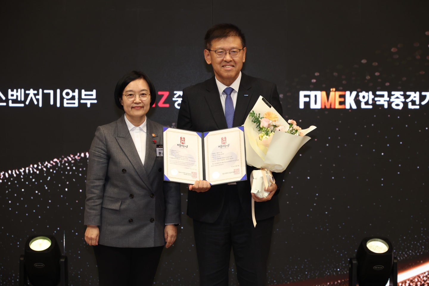 명문장수기업으로 선정된 하이멕 이수연 대표(우)가 한성숙 중소벤처기업부 장관과 기념촬영하고 있다.