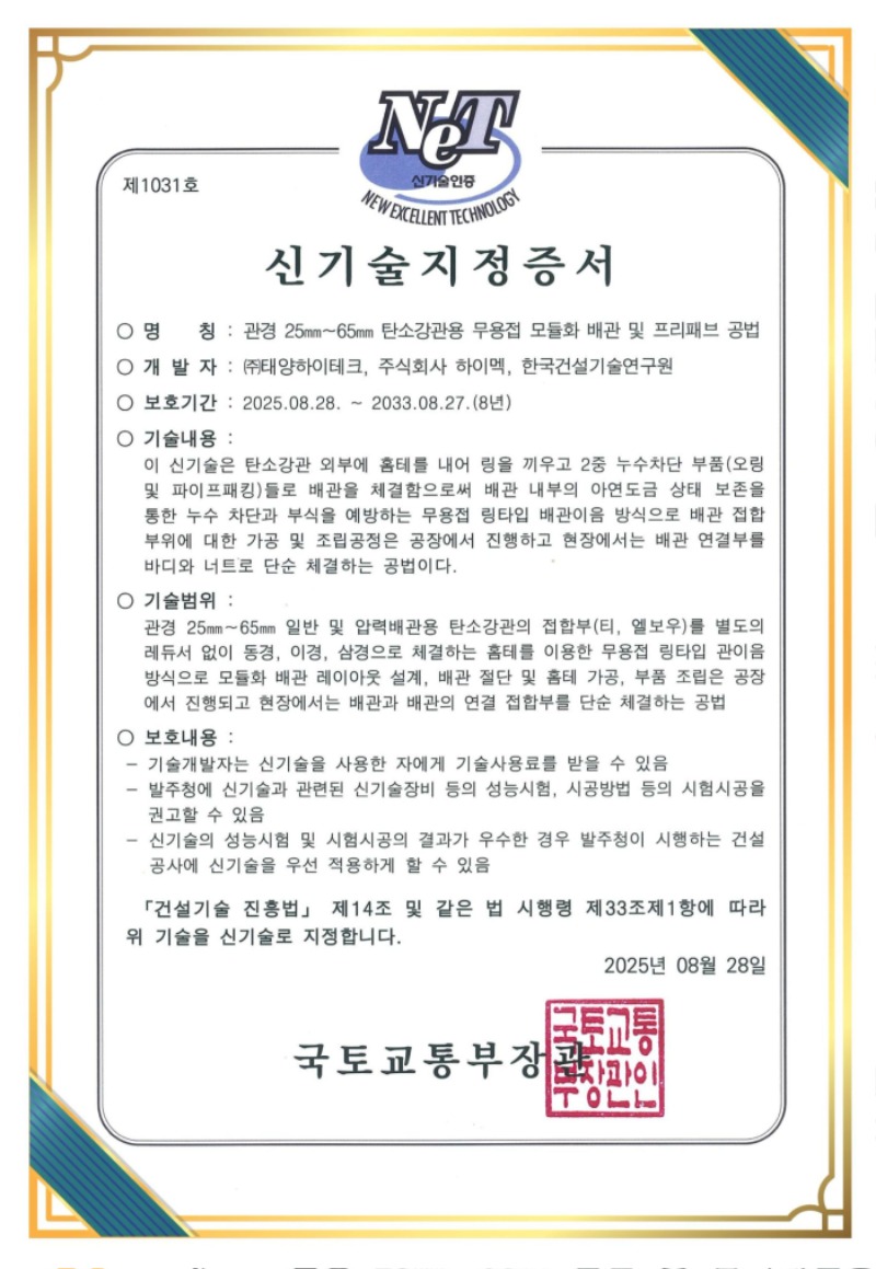 국토교통부 건설신기술로 지정되었습니다.