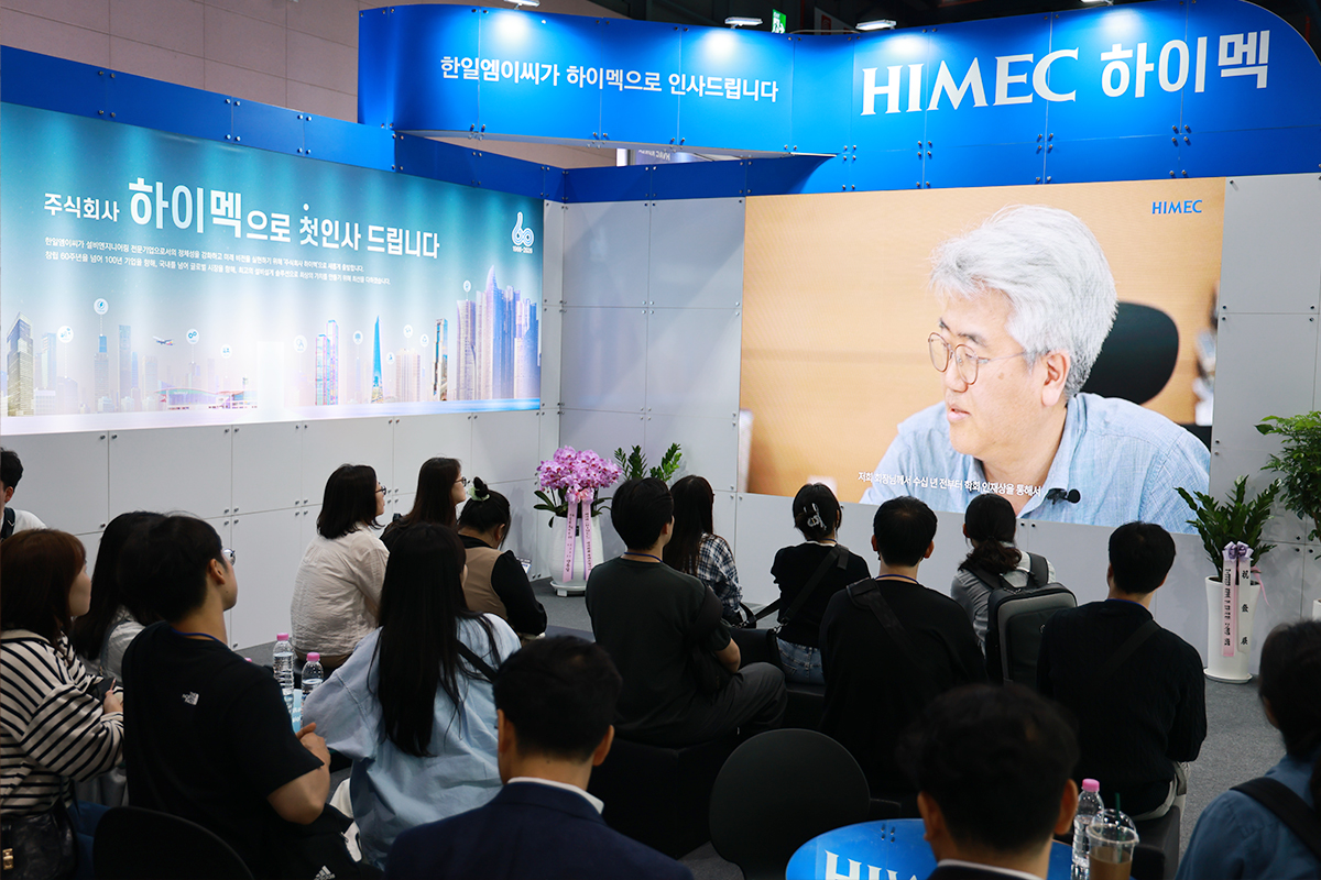 2024 대한민국 기계설비전시회 전시 부스에서 방문객들이 하이멕 홍보영상을 관람하고 있다.